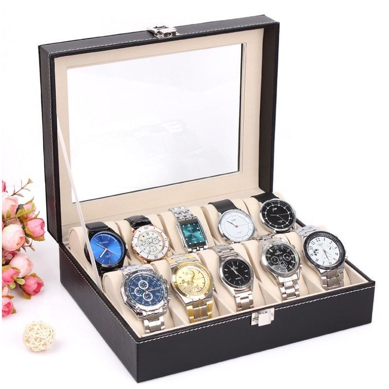 Aceasta cutie permite pastrarea in conditii desavarsite a 10 ceasuri, in spatii bine delimitate si captusite cu catifea moale, in nuanta de crem. Exteriorul cutiei pentru ceasuri este confectionat din piele ecologica neagra, avand pe margini cusaturi fine, asortate cu culoarea matasoasei catifele, desavarsind designul elegant al intregii cutii. In plus, capacul este din geam transparent, spre a oferi admiratiei colectia de ceasuri pe care o adaposteste.