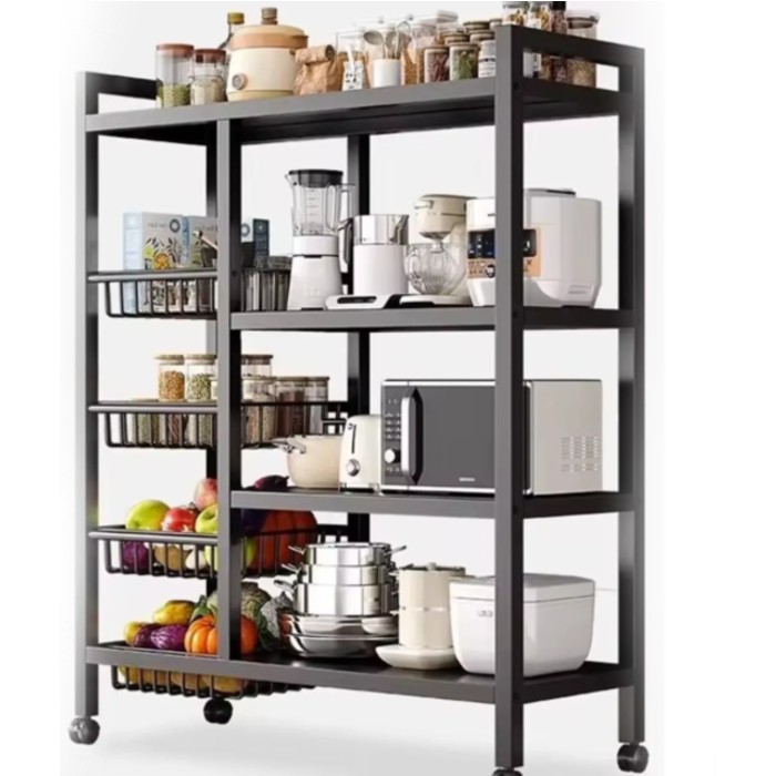 Capacitate mare de depozitare - cu dimensiunile sale generoase (90 (L) x 32 (l) x 108 (H) cm), acest raft poate acomoda diverse electrocasnice, legume/fructe, carti, vase, condimente sau orice alte articole de bucatarie. Structura solida - stabilitatea sporita este asigurata atat de cadrul suportului confectionat integral din metal, cat si de cele 3 cosuri si 4 polite metalice.