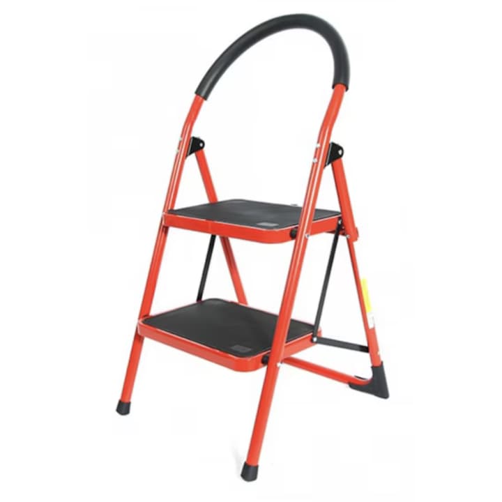 Scara pliabila din metal, 2 trepte late, 100 kg, Rosu-Negru