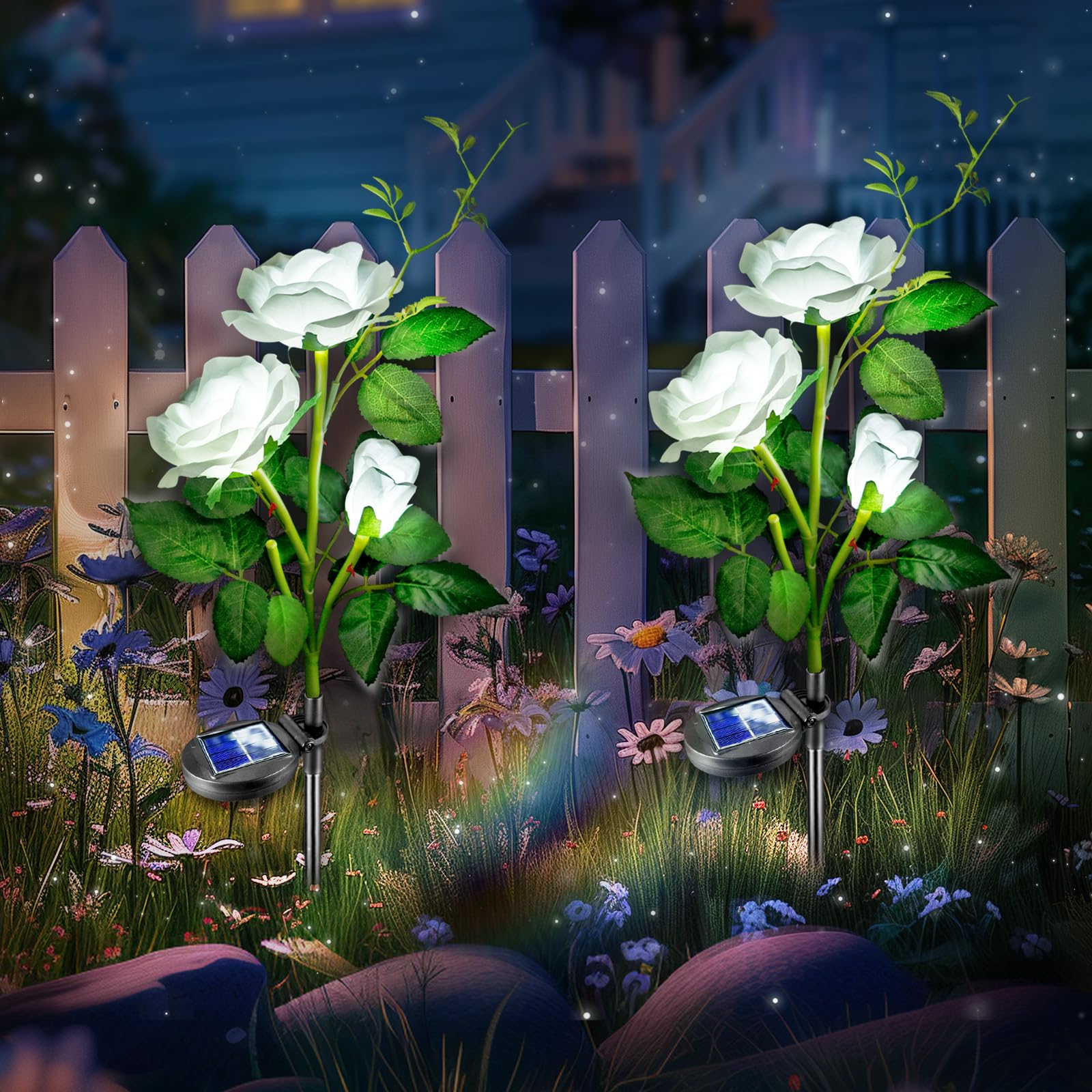 Adauga un farmec romantic gradinii tale cu acest set de 2 lampi solare trandafir alb cu 3 flori LED fiecare! Un decor elegant si functional, perfect pentru alei, gradini, curti, jardiniere sau chiar ghivece mari. Se incarca ziua de la soare si lumineaza noaptea automat – fara cabluri sau consum electric.
